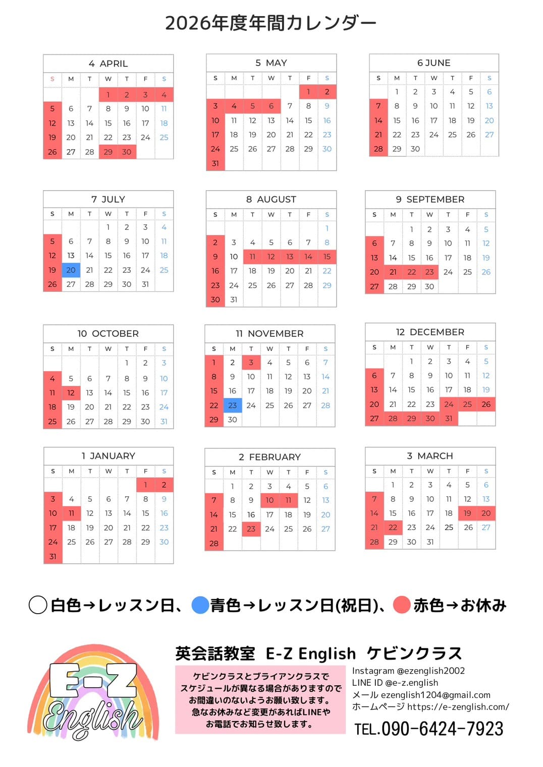 | 注意事項 | まれに途中で新クラスを開講することがございます。 英語レベルや年齢などによって、途中入会が可能なケースがございます。ご相談ください。 ご兄弟やお友達などの関係で、クラス編成に希望がある場合はご相談ください。 体験レッスンはお一人様1回限りです。 |